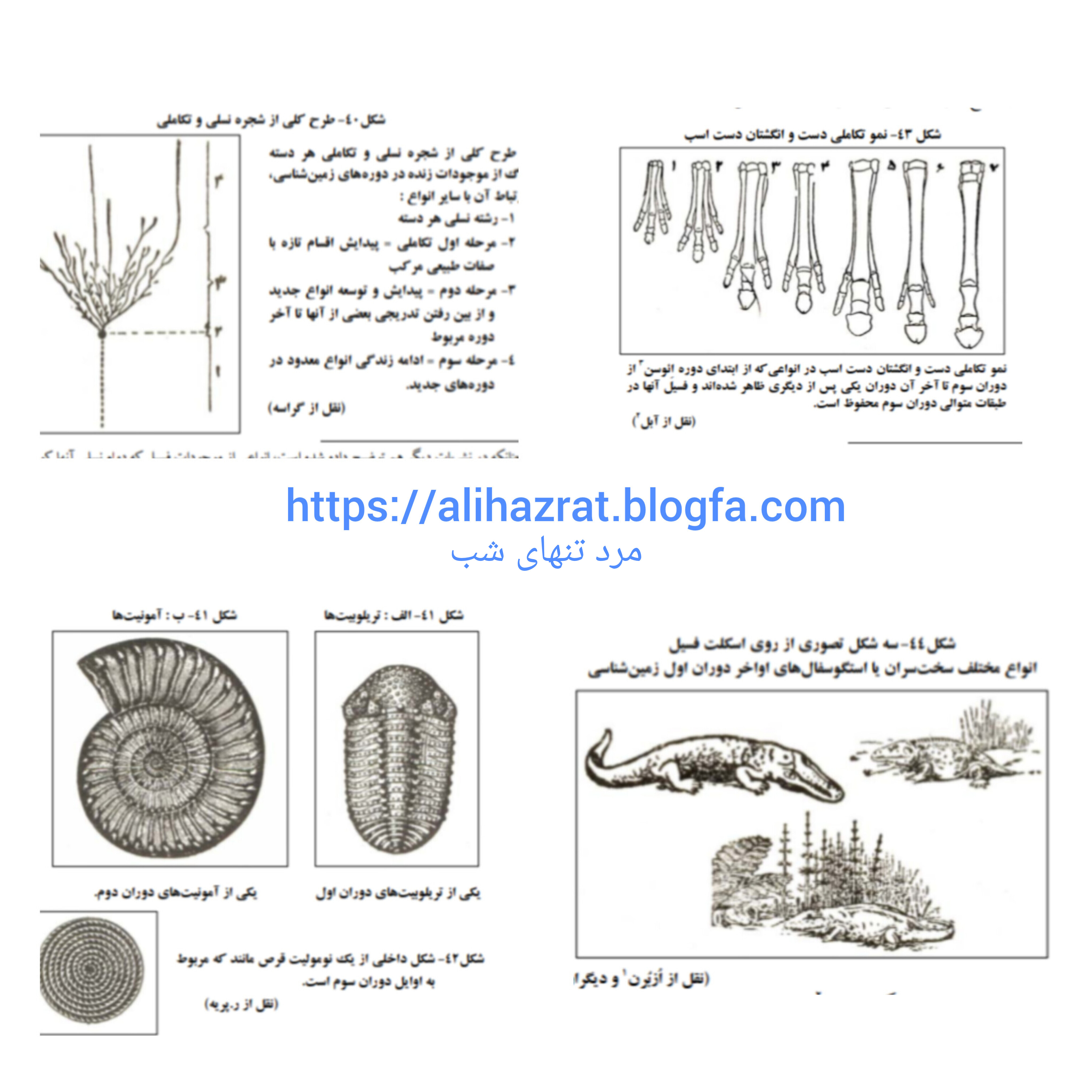 ( شكل -41 الف) در تمام دوران اول و تكامل آمونيت ها (شكل-41 ب) و خزندگان در دوران دوم و تكامل نوموليت ها (نوموليتها (Nummulites) 🌺 (گروهي از تك ياختگان فسيل هستند كه مثل هم شكلهاي روزنه دار امروزي آنها ، يك محفظه آهكي ، جسم آنها را احاطه كرده بود. همين محفظه است كه به تعداد بي شمار به حال فسيل باقيمانده و از آنها قشرهاي وسيع و ضخيم سنگ آهك ، مثل طبقات كوه سيمان شيراز و طبقات سنگهاي سرخ آشتيان و ساير نقاط تشكيل شده است.)
